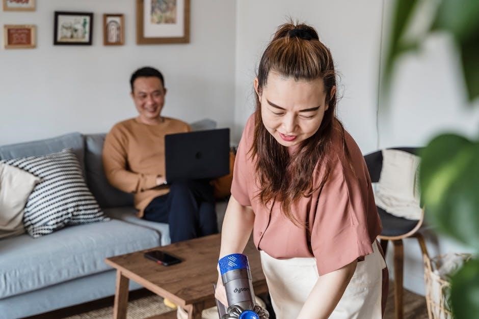 The Dyson DC39’s extension wand allows you to effortlessly clean ceilings, curtains, and hard-to-reach areas. Connect the wand securely to the main body and select a suitable attachment, such as the combination tool for versatile cleaning. Maintain a stable grip and adjust the wand’s length for optimal reach.